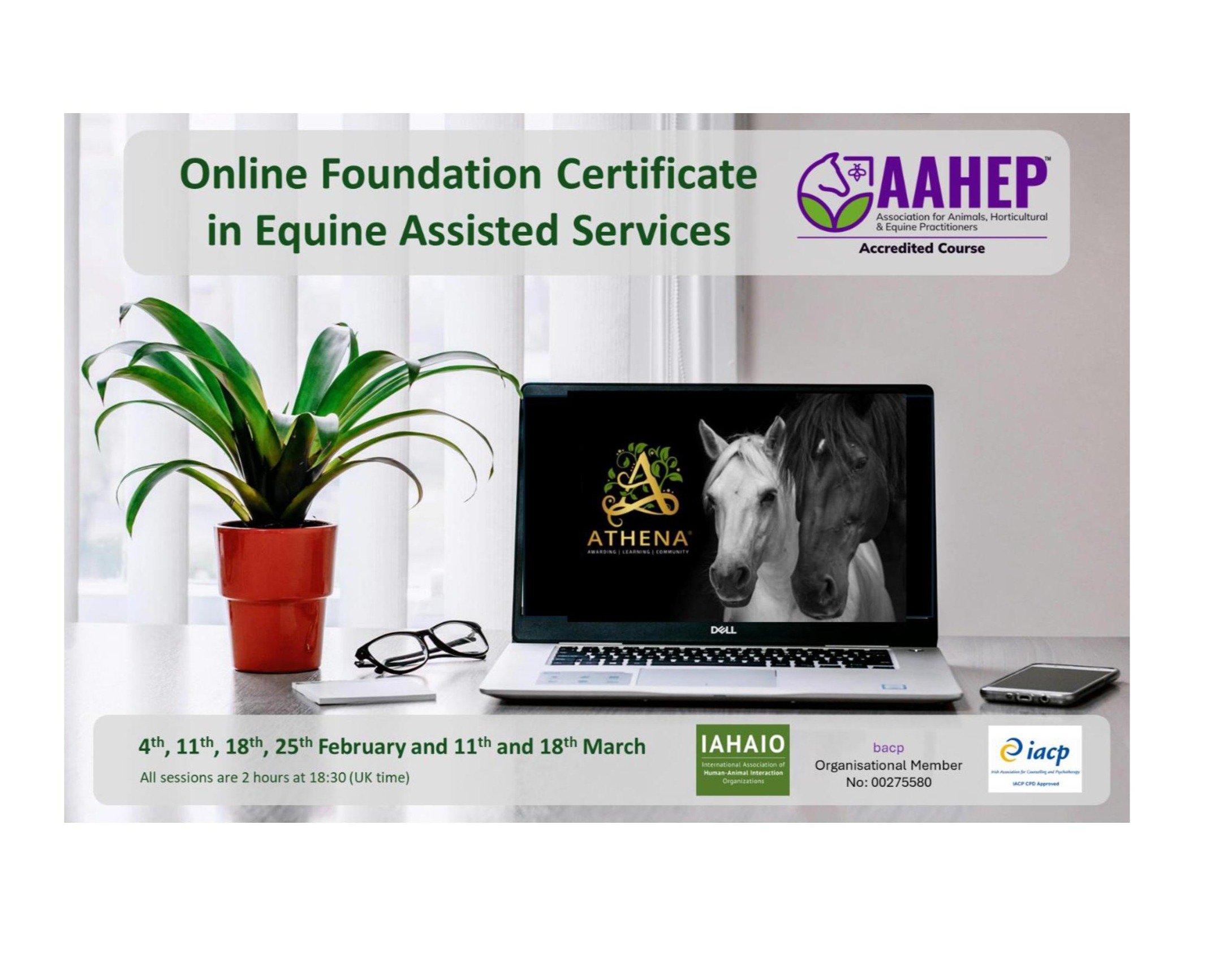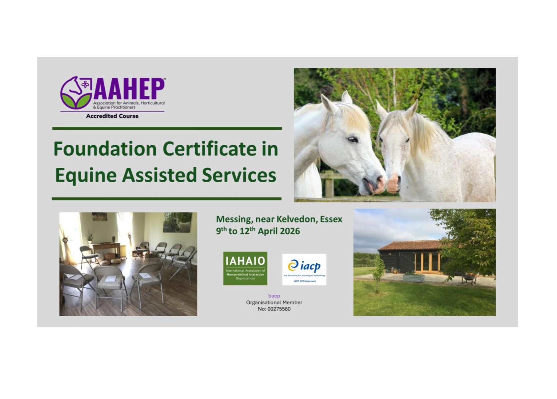 04 Feb ~ 19 Mar EAS Foundation Certificate – Online Seven week online Foundation Certificate In Equine Assisted Services – January 2025 (Externally accredited by ACCPH and IACP CPD Approved) Starring Elizabeth and Gemma More Info 09 Apr ~ 12 Apr EAS Foundation Certificate – Essex UK Join us for our unique Foundation Certificate in Equine Assisted Services (EAS, EAL, EAP, EFL, EFP) Starring Jane and Michaela More Info 18 Jun ~ 21 Jun EAS Foundation Certificate – Shropshire UK Join us for our unique Foundation Certificate in Equine Assisted Services (EAS, EAL, EAP, EFL, EFP) Starring Therese and Michaela More Info